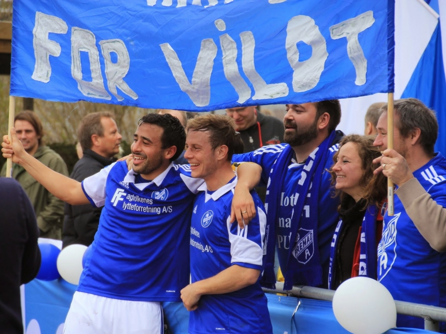 Mohammed Abdalas til venstre sammen med Rune Friis og en række glade Fremad-fans efter sejren over FC Helsingør.